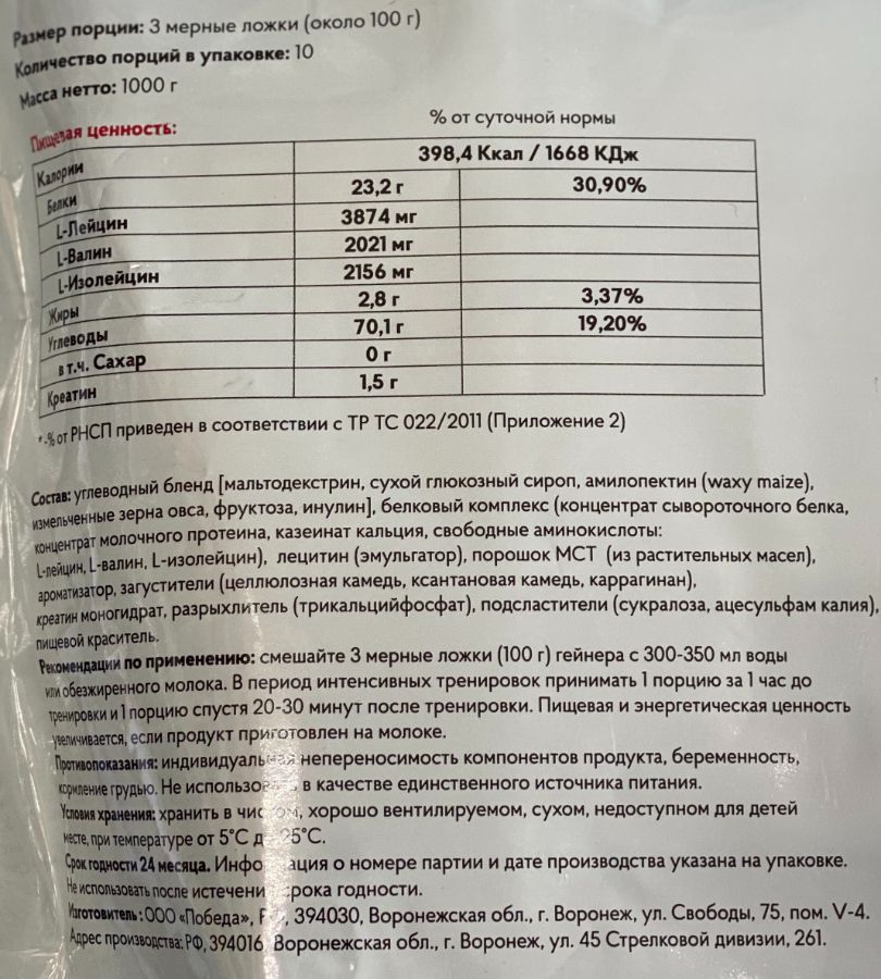 Принимать сразу по окончанию тренировки и в день отдыха 1-2 порции между основными приемами пищи
